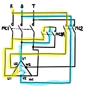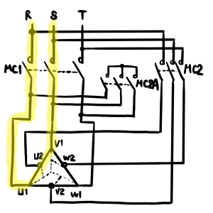 巻線の途中から新たに引き出し、端子を設けているのが特徴です。実際には、定トルクにしたいのか、定速度にしたいのかによって、端子番号は変わります。通常の低速運転と呼ばれる場合は、下記の通り、MC1がONし、デルタ結線となります。
