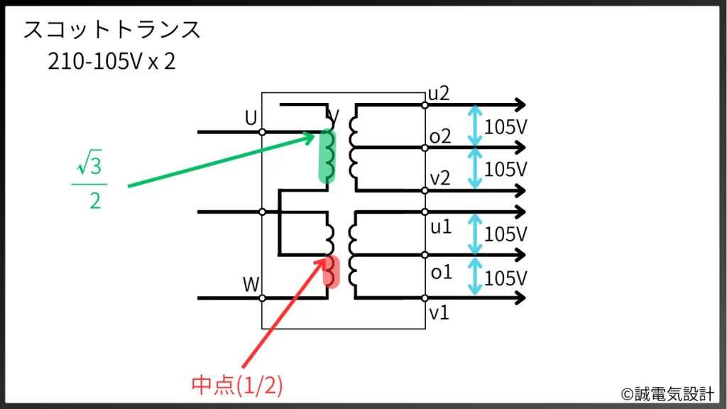 M座の一次巻線は、三相電源の2線間(例えばR相とS相)に直接接続されます。一方のT座は、一方の端子を三相の残り1相(T相)に接続し、もう一方の端子をM座の一次巻線の中点、すなわち巻数比でちょうど50%の位置にあるタップに接続します。ここで重要なのが、T座の一次巻線の巻数です。M座の巻数に対して\(\displaystyle\frac{\sqrt{3}}{2} \)、つまり約86.6%の巻数に設計されています。この絶妙な巻数比の構成によって、二次側には電圧の大きさが等しく、かつ位相が正確に90度ずれた2系統の単相出力が現れるのです。