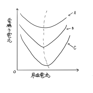 図は三相同期電動機の位相特性曲線(V曲線)の一例である。同期電動機は、界磁電流を変えると、電機子電流の端子電圧に対する位相が変わり、さらに、電機子電流の大きさも変わる。